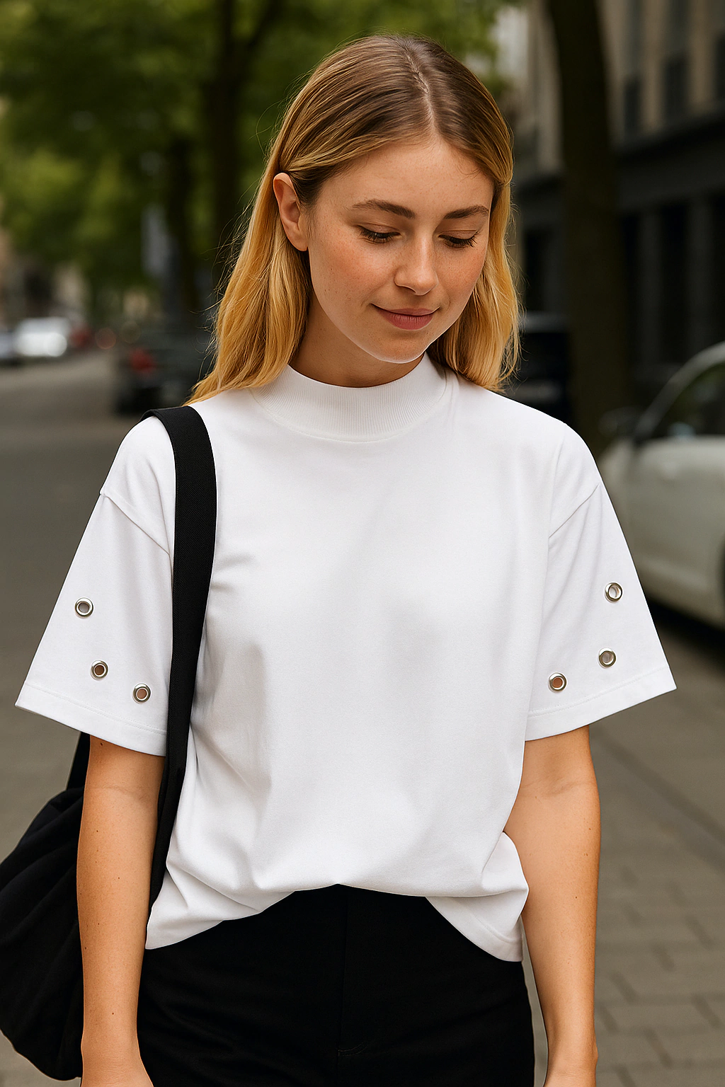 O grande diferencial está nos ilhoses metálicos aplicados nas mangas, que adicionam personalidade e uma pegada rocker ao visual. Um detalhe simples que transforma a t-shirt básica em uma escolha cheia de atitude para o dia a dia.